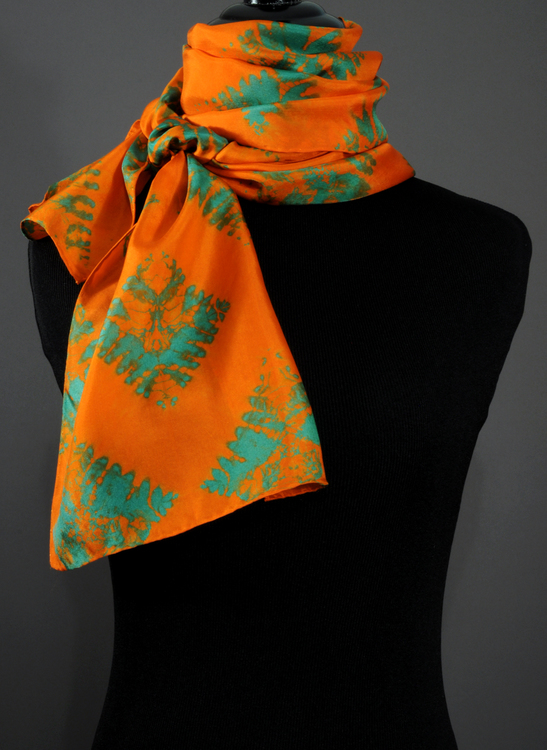 Orange and green aqua scarf dyed using the nui shibori technique of stitching and binding.