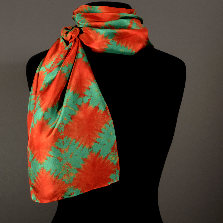 Burnt orange and green argyle diamond pattern. The pattern is created by hand stitching and binding, a Nui Shibori technique.